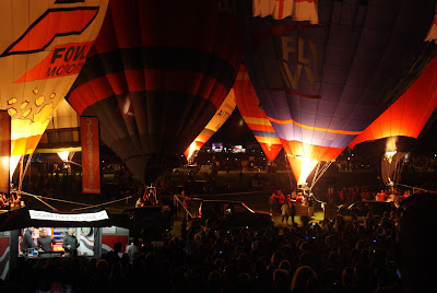 Once it started to get dark, the balloons looked amazing when their flames were burning...At last it was time for the Night Glow! Music was played through huge speakers, and it was like one big disco. (The people in a cigarette kiosk were really getting into it!) We all stood and watched while two long rows of balloons lit up in patterns, in time to the music. It went on for quite a while, and was just fantastic!! The balloons were just so massive and spectacular - the pictures don't do them justice!